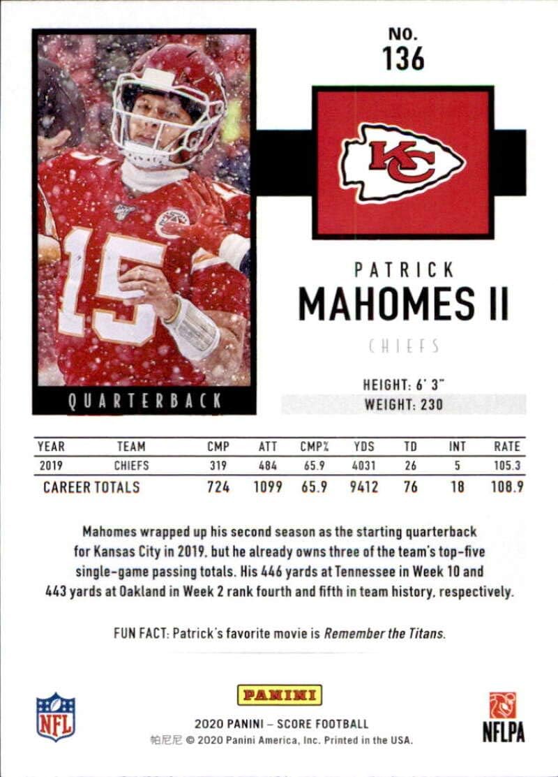 Amazon Com 2020 Score Football 136 Patrick Mahomes Ii Kansas City Chiefs Official Nfl Trading Card From Panini America Sports Outdoors